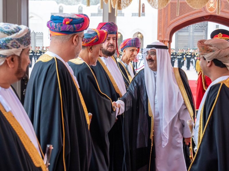 Then, His Majesty the Sultan shook hands with members of the official delegation accompanying the Emir of Kuwait, wishing them a pleasant stay. On his turn, the Emir shook hands with some members of the Royal Family, Chairmen of the State Council and Shura Council, ministers, commanders of the Sultan’s Armed Forces (SAF) and the Royal Oman Police (ROP).